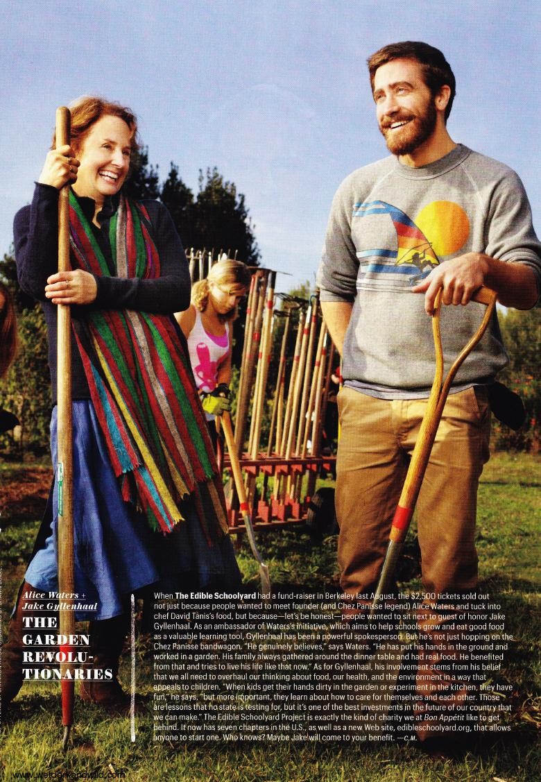 ... even though we don't get new pictures of Jake in a tux, we have the next best thing - Jake with a spade. Yes, Jake appears with his his fellow Garden Revolutionary Alice Waters in the March issue of Bon Appetit. 'He genuinely believes... he has his hands in the ground', says Alice of Jake. Click and it shall be embiggened. Many thanks to BBMISwear for the scan!